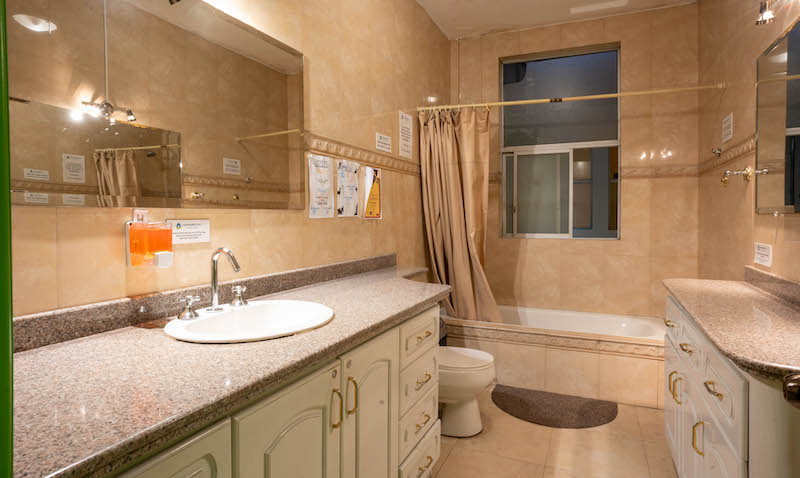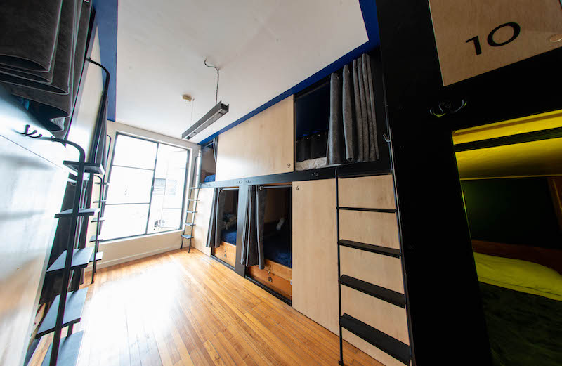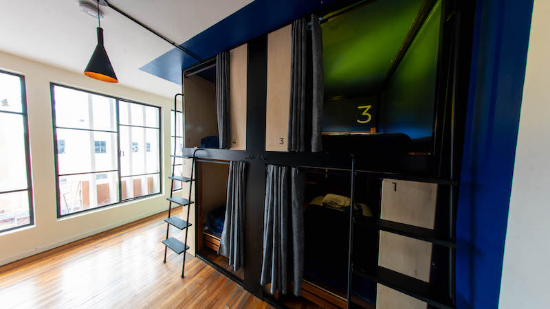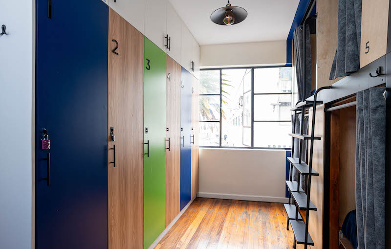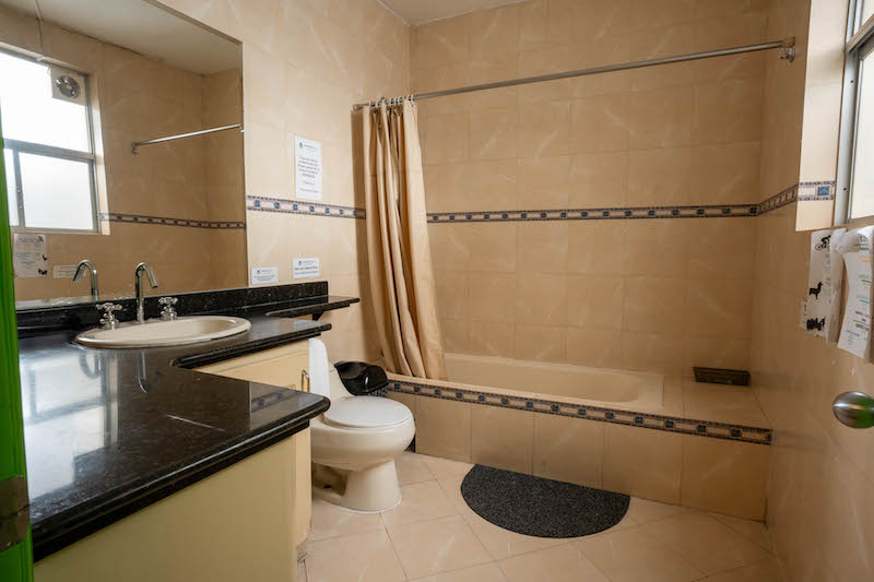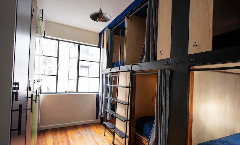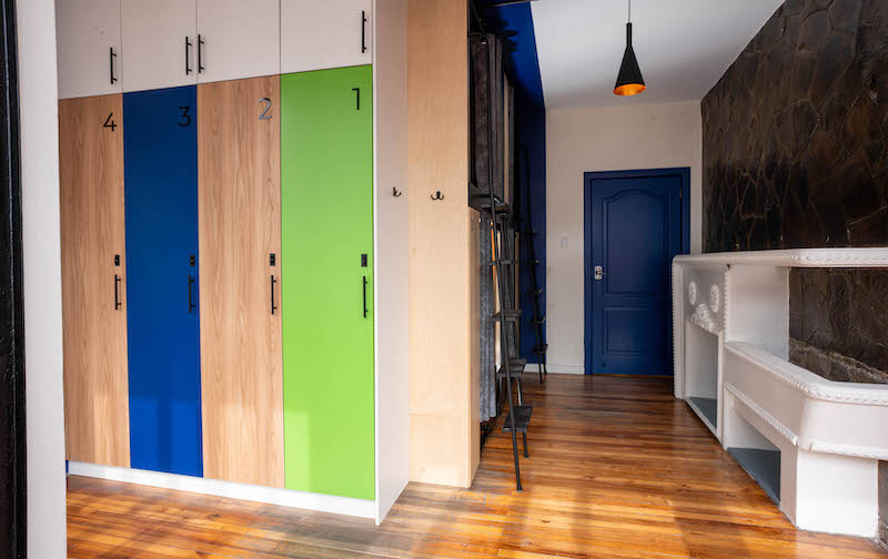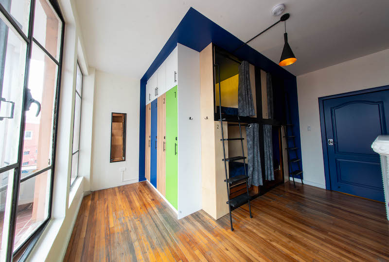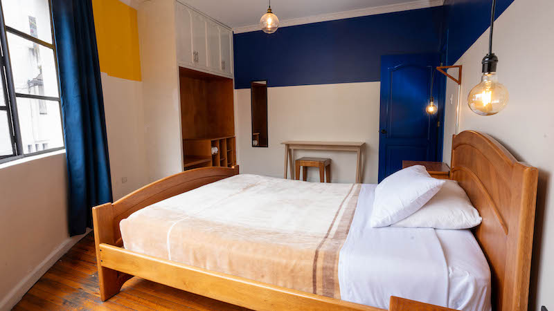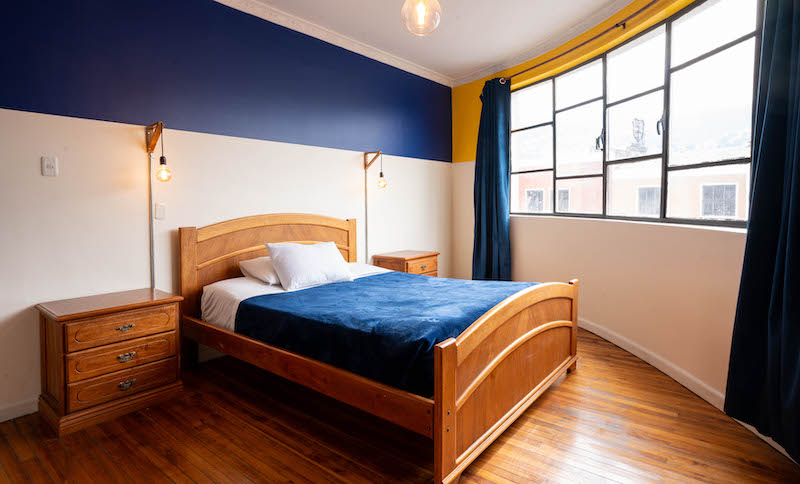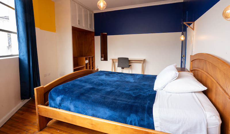 Our Deluxe Private Rooms feature a plush Queen-sized bed, a desk for work or planning your next adventure, and blackout curtains to ensure a restful night’s sleep. Thoughtfully designed with ample shelving and storage space, you’ll have plenty of room to unpack and feel at home. Wake up to stunning views of the city skyline and surrounding Andean mountains—your cozy retreat in the heart of Quito.